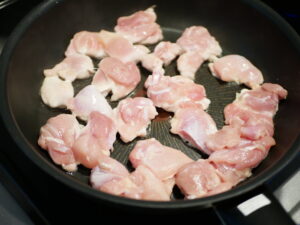 2.フライパンに鶏肉の皮目を下にして並べ、中火でこんがり焼きます。