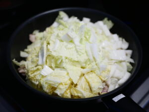 3.焼き色がついたら裏返し、塩を振ります。白菜を乗せて蓋をし、弱めの中火で10分〜15分ほど加熱します。