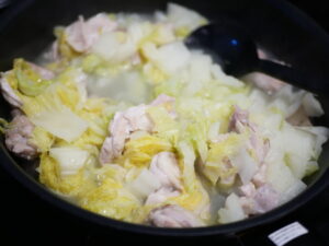 1.鶏肉は余分な皮や脂身を取り除き、一口大に切ります。白菜は1〜2cm幅のざく切りにします。