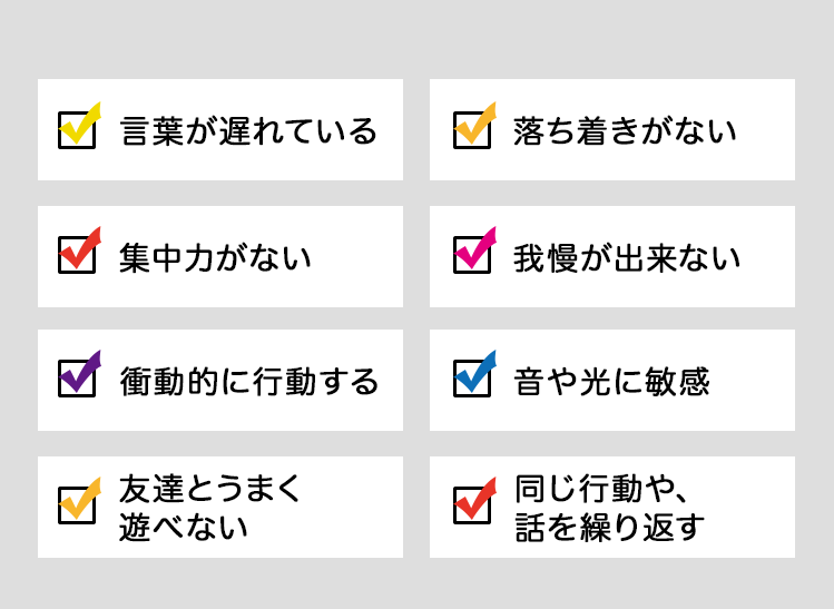 不注意や多動は感覚面の偏りや様々な情報を短時間に同時に脳で情報処理することが難しいために起きると考えられています。集中しやすい環境で集中しやすい課題を段階的に用いて少しずつ集中し落ち着いて過ごせる時間を伸ばしていくよう働きかけます。
